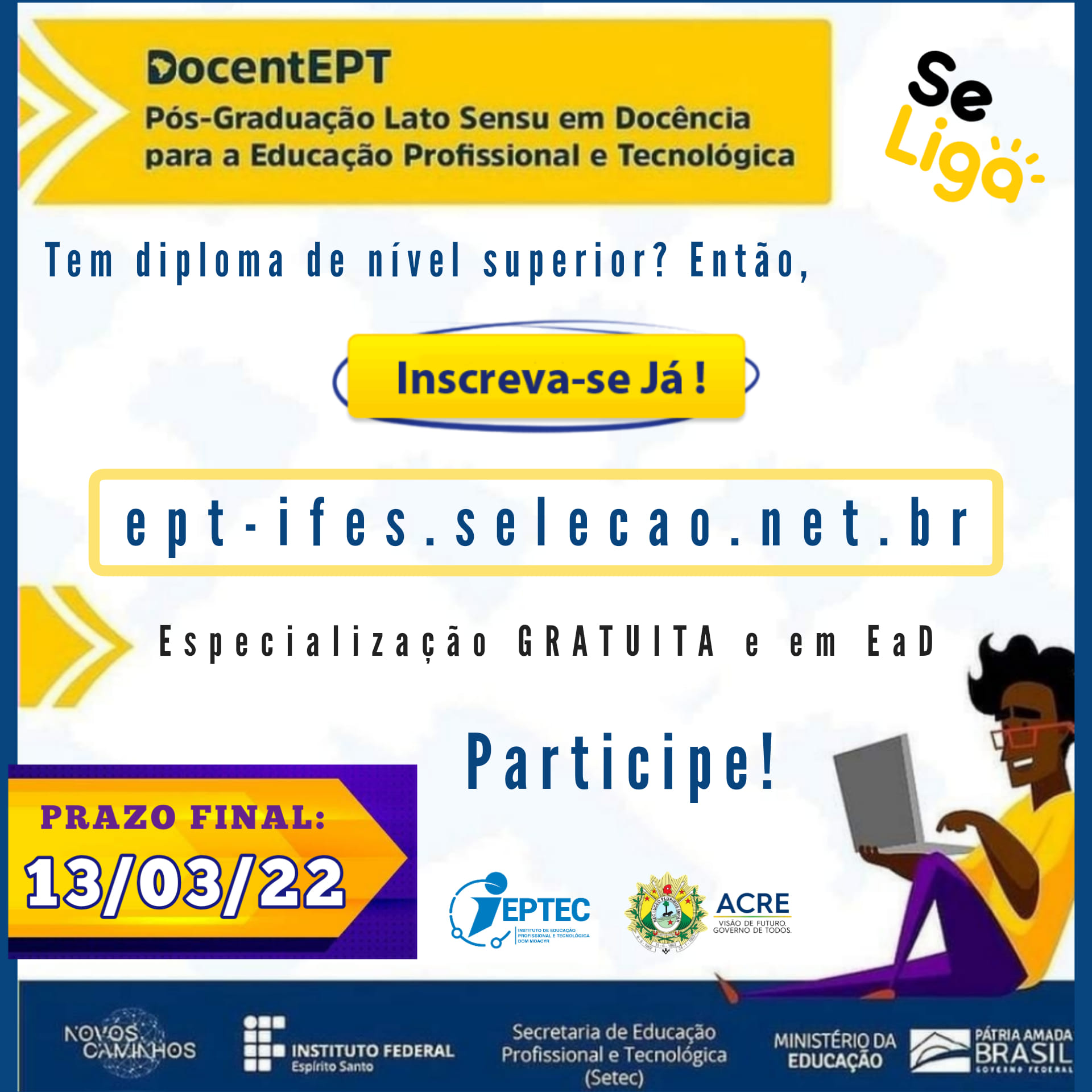Você que tem diploma de nível superior e deixou para última hora a sua inscrição no processo seletivo com vagas para o curso de pós-graduação DocentEPT, ESSA É A SUA ÚLTIMA CHANCE DE CONCORRER!