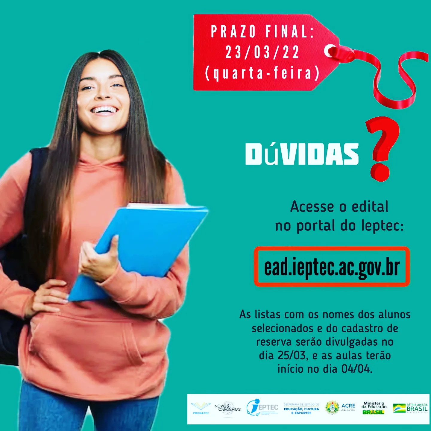 A forma de seleção será por ordem de inscrição, e as listas com os nomes dos estudantes selecionados e do cadastro de reserva serão divulgadas no dia 25/03, aqui na plataforma do Ieptec, e nas redes sociais do instituto (ieptecacre).