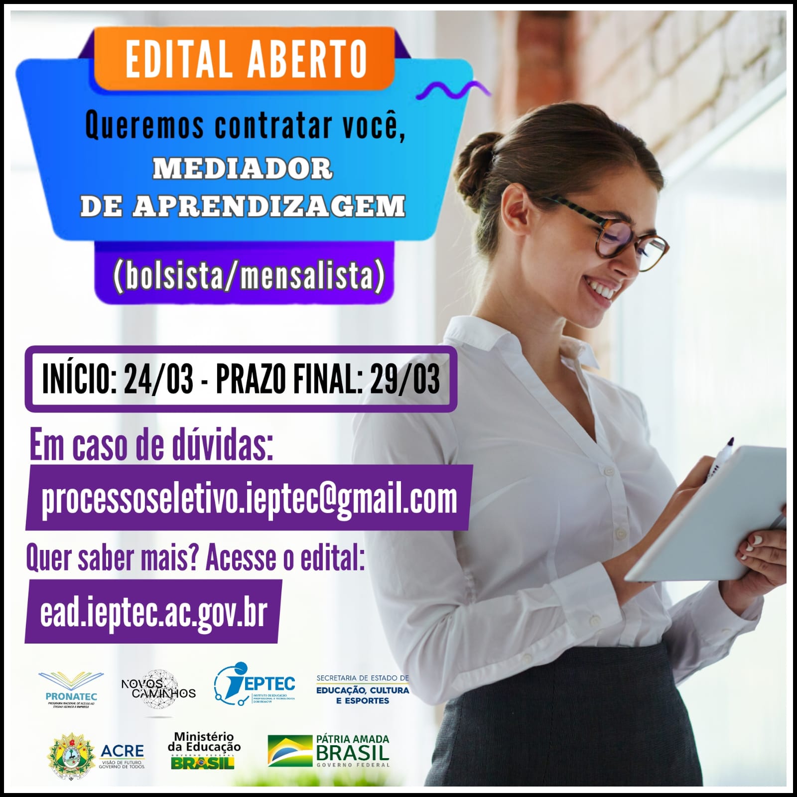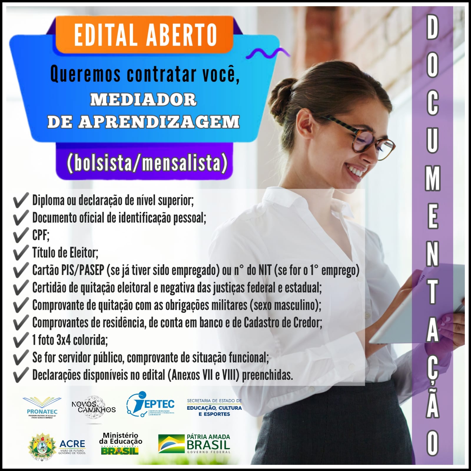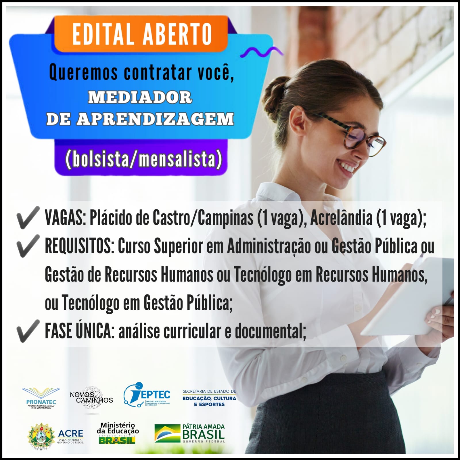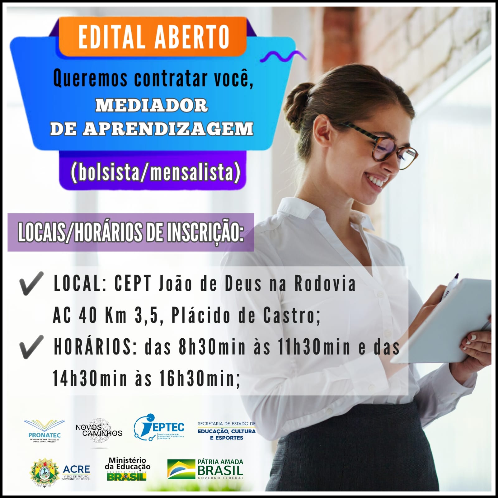 INSCREVA-SE JÁ PARA CONCORRER A UMA VAGA PARA O CARGO DE MEDIADOR DE APRENDIZAGEM (BOLSISTA/MENSALISTA).