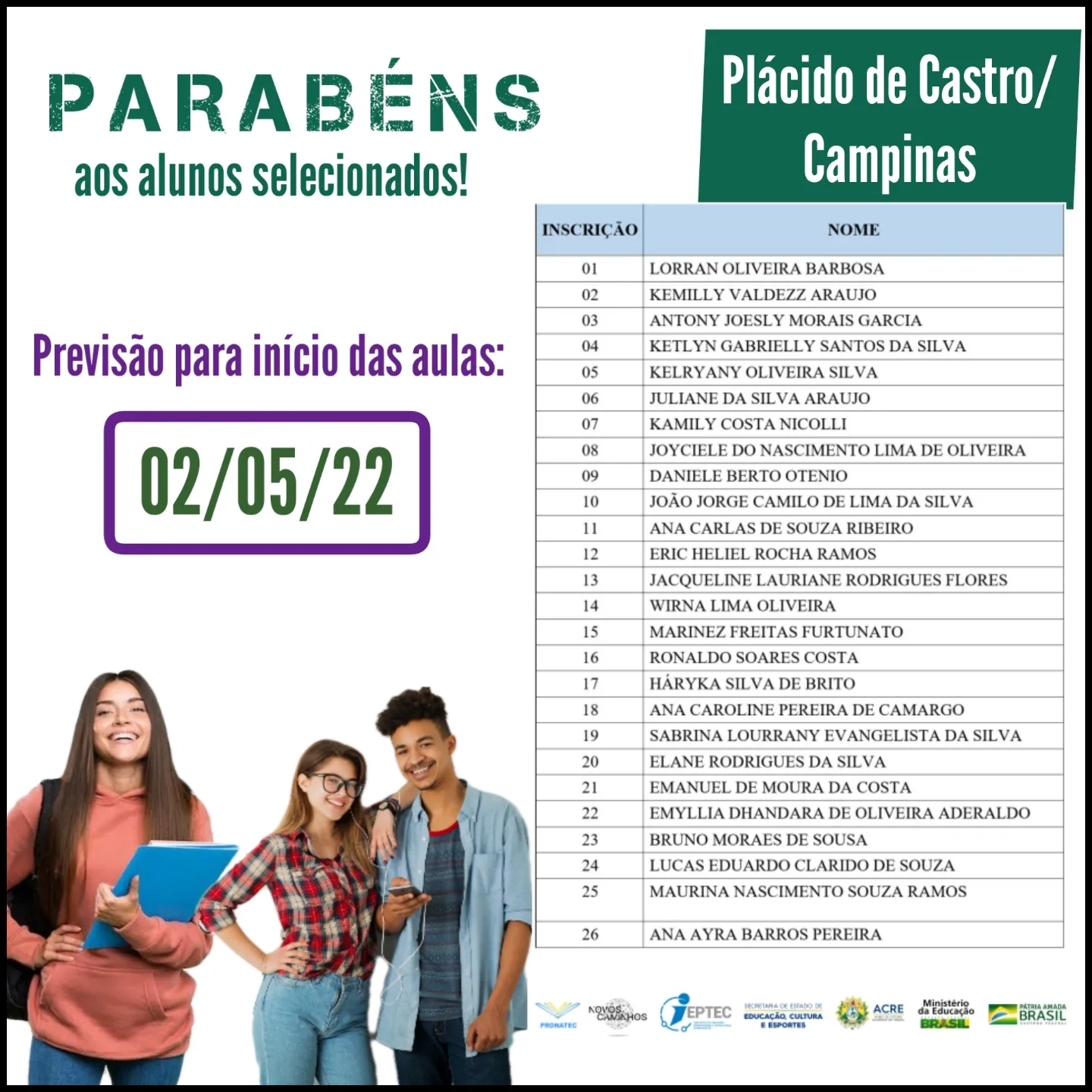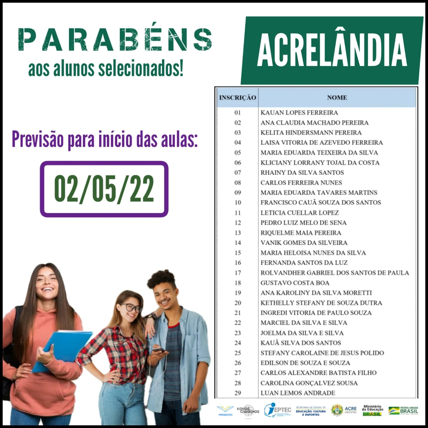 Se você é aluno do 2° ano do ensino médio, estuda em Acrelândia ou Plácido de Castro/Distrito de Campinas, e realizou sua inscrição para ingresso no curso técnico em SERVIÇOS PÚBLICOS ou ADMINISTRAÇÃO pela rede Ieptec, então CONFIRA A LISTA E SAIBA SE VOCÊ É UM DOS SELECIONADOS 😀