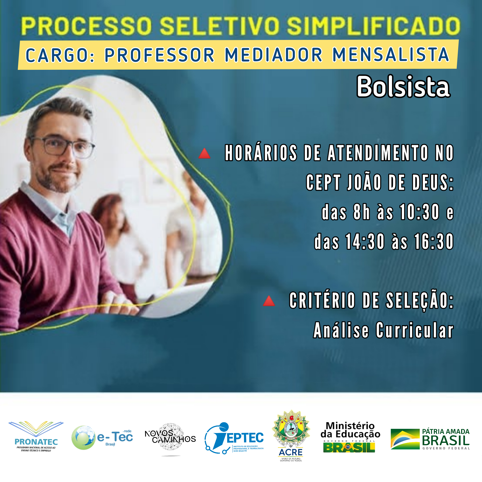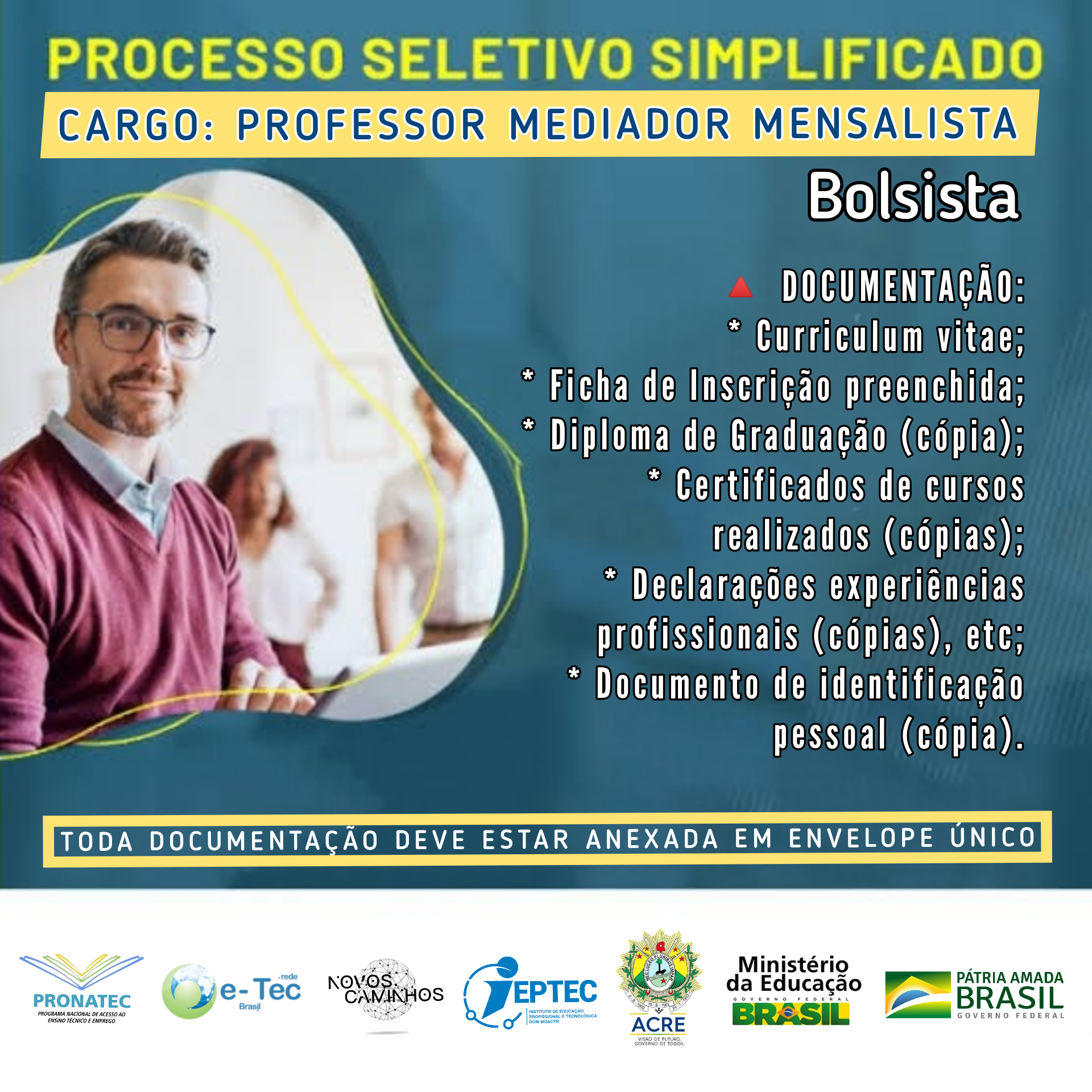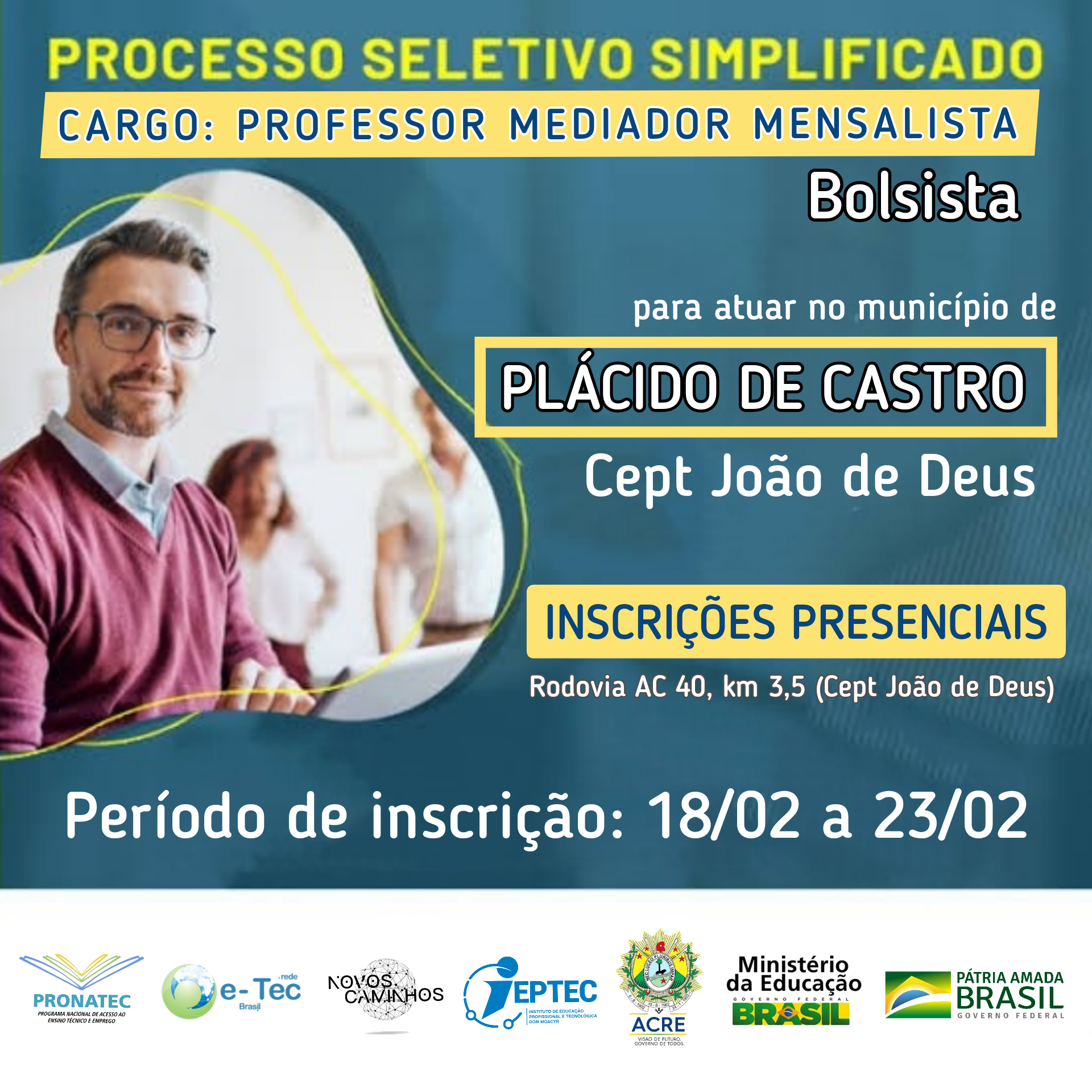 O governo do Estado, por meio do Ieptec Dom Moacyr abre processo seletivo simplificado de seleção de bolsista para o cargo de professor mediador mensalista, para atuar no município de Plácido de Castro.