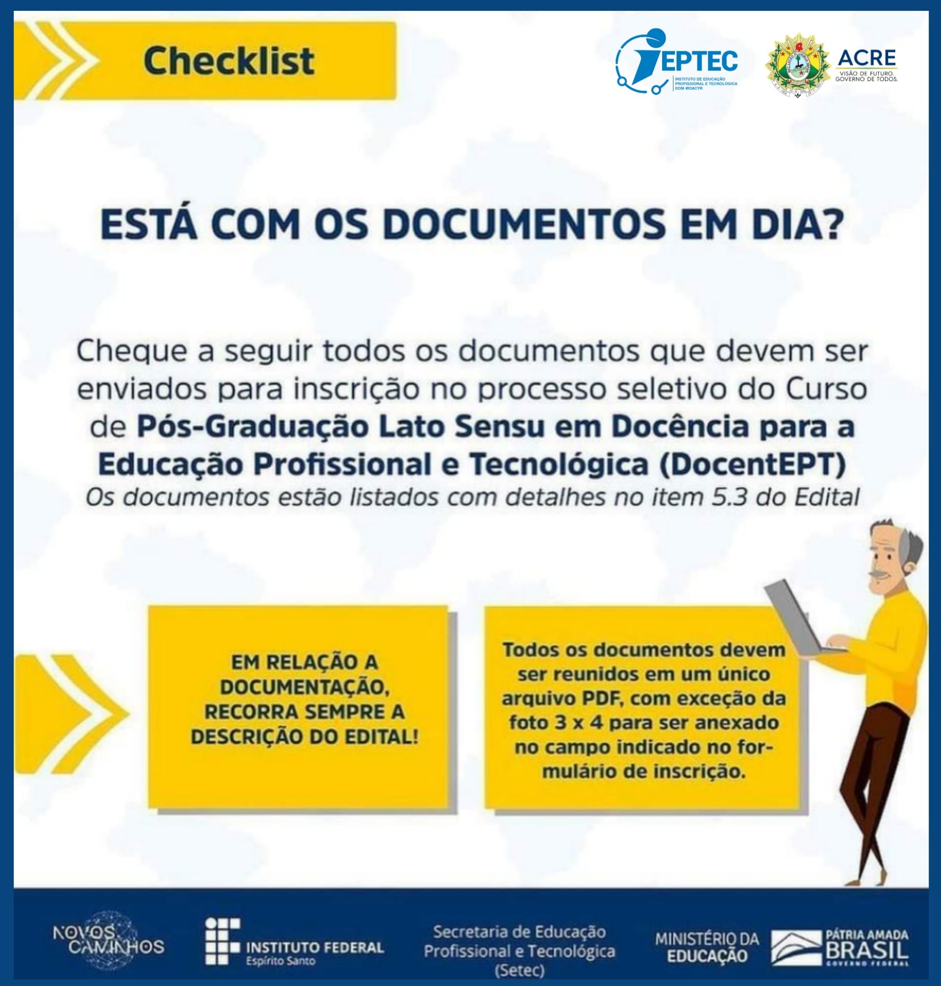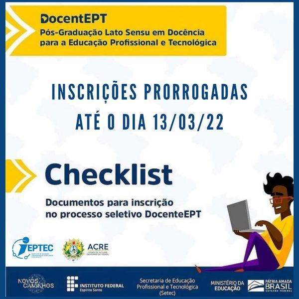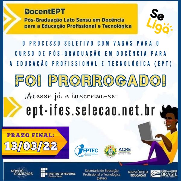 Você que tem diploma de nível superior e deixou para última hora a sua inscrição no processo seletivo com vagas para o curso de pós-graduação DocentEPT, ESSA É A SUA ÚLTIMA CHANCE DE CONCORRER!