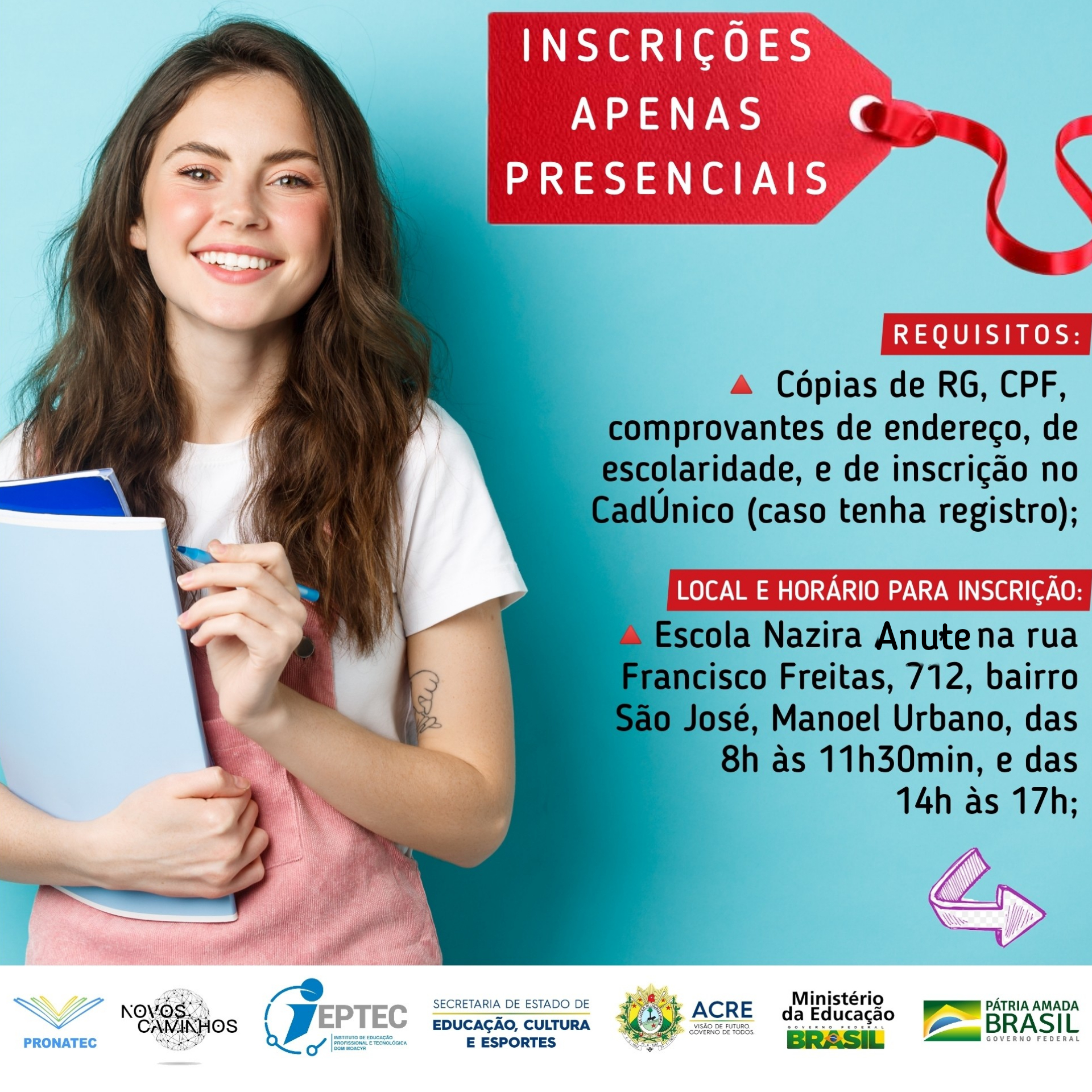 As inscrições seguem abertas até o dia 10 de março, e acontecem apenas de forma presencial pelo preenchimento de ficha de inscrição. Os candidatos interessados devem comparecer à Escola Nazira Anute de Lima, situada à rua Francisco Freitas, n° 712, bairro São José, Manoel Urbano, nos horários das 08h às 11h30min, e das 14h às 17h.