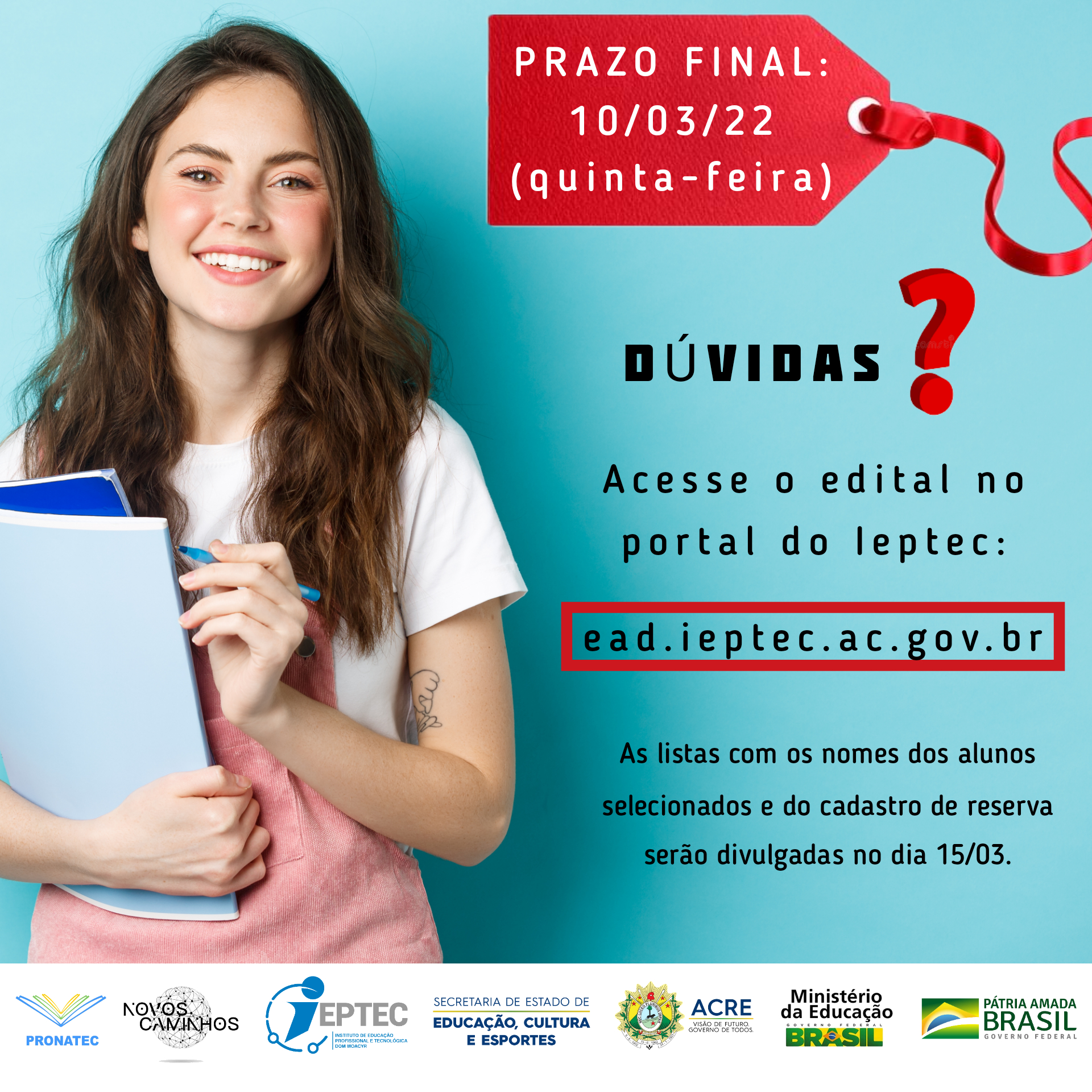 A forma de seleção será por ordem de inscrição, e as listas com os nomes dos estudantes selecionados e de cadastro de reserva serão divulgadas no dia 15 de março, aqui na plataforma do Ieptec, e nas redes sociais do instituto (ieptecacre).