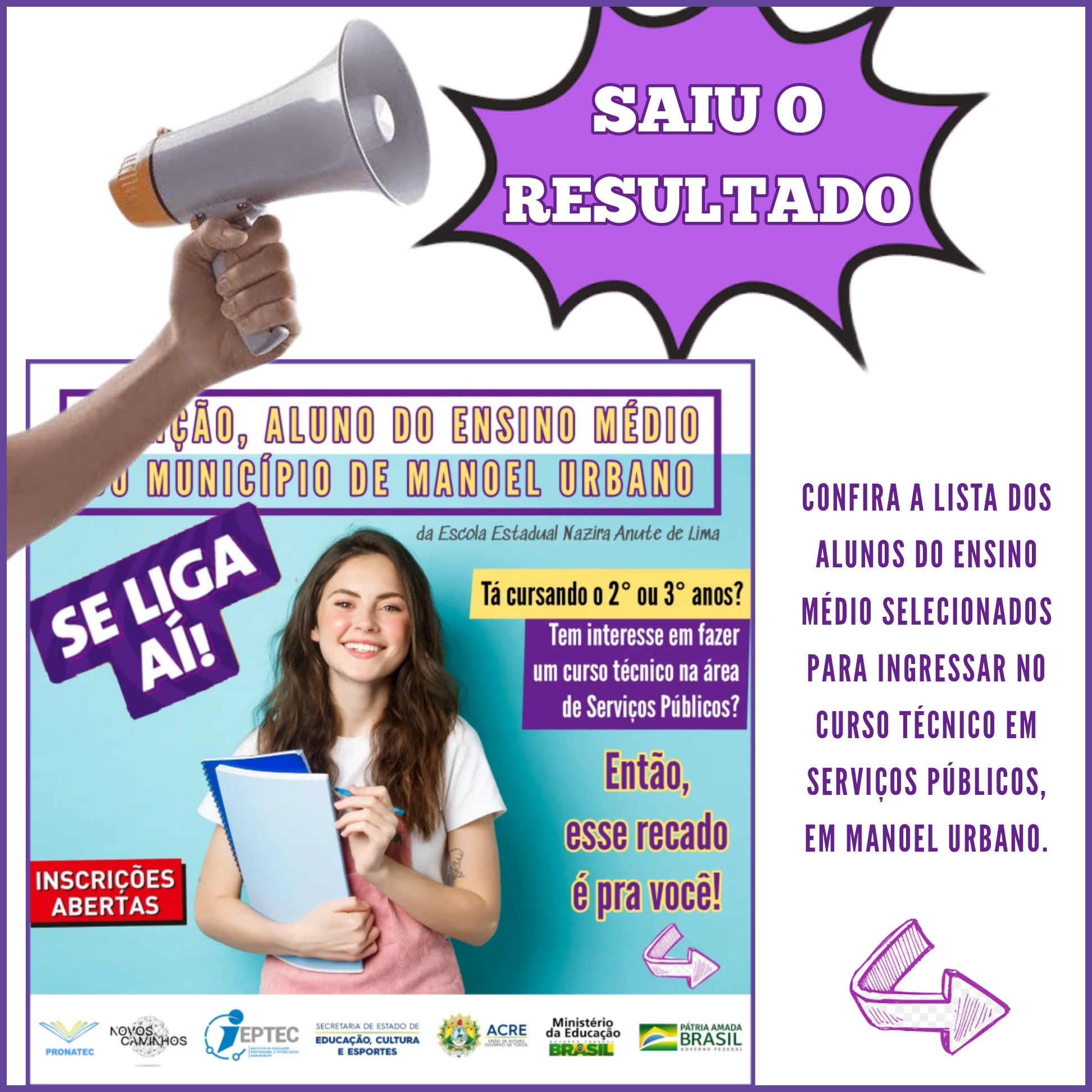 ATENÇÃO, ALUNOS DO ENSINO MÉDIO DO MUNICÍPIO DE MANOEL URBANO!! SAIU A LISTA DE SELECIONADOS PARA O CURSO TÉCNICO EM SERVIÇOS PÚBLICOS!! CONFIRA!
