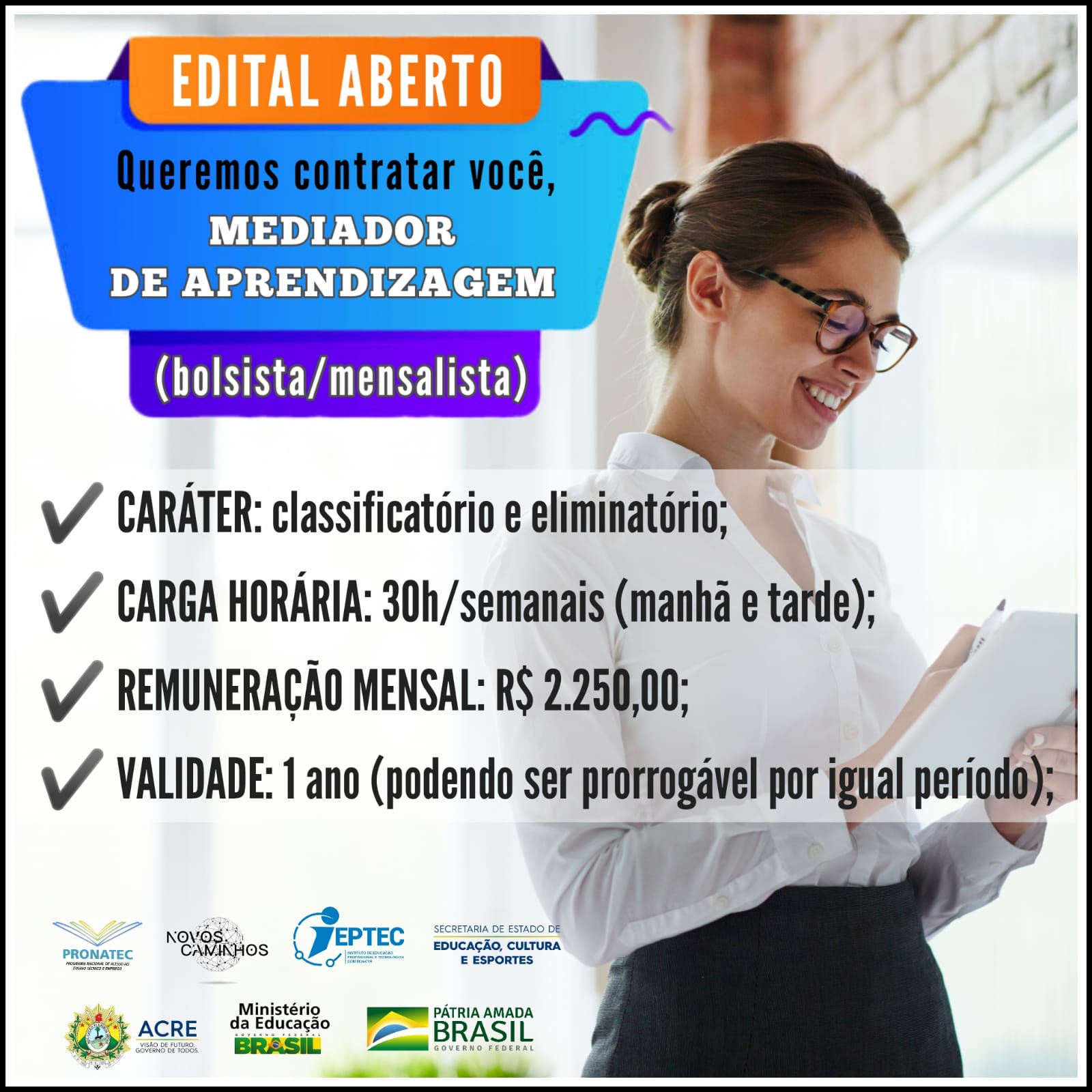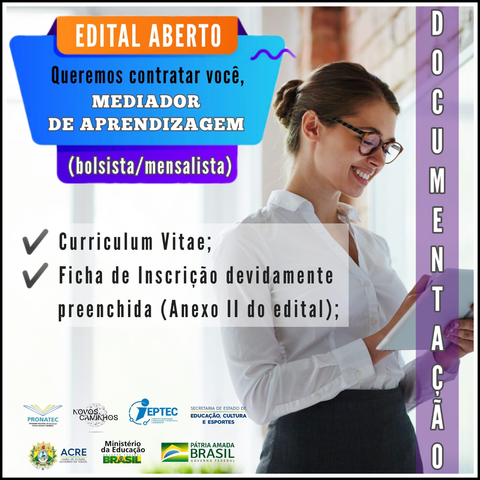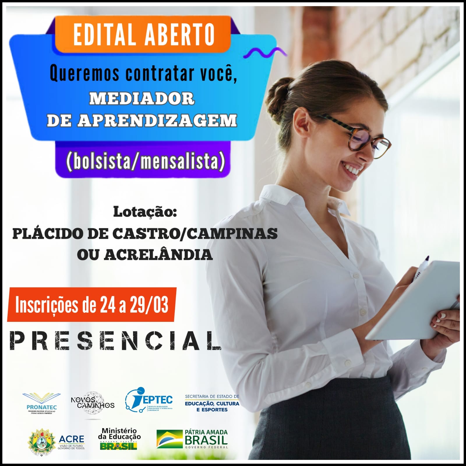 INSCREVA-SE JÁ PARA CONCORRER A UMA VAGA PARA O CARGO DE MEDIADOR DE APRENDIZAGEM (BOLSISTA/MENSALISTA).