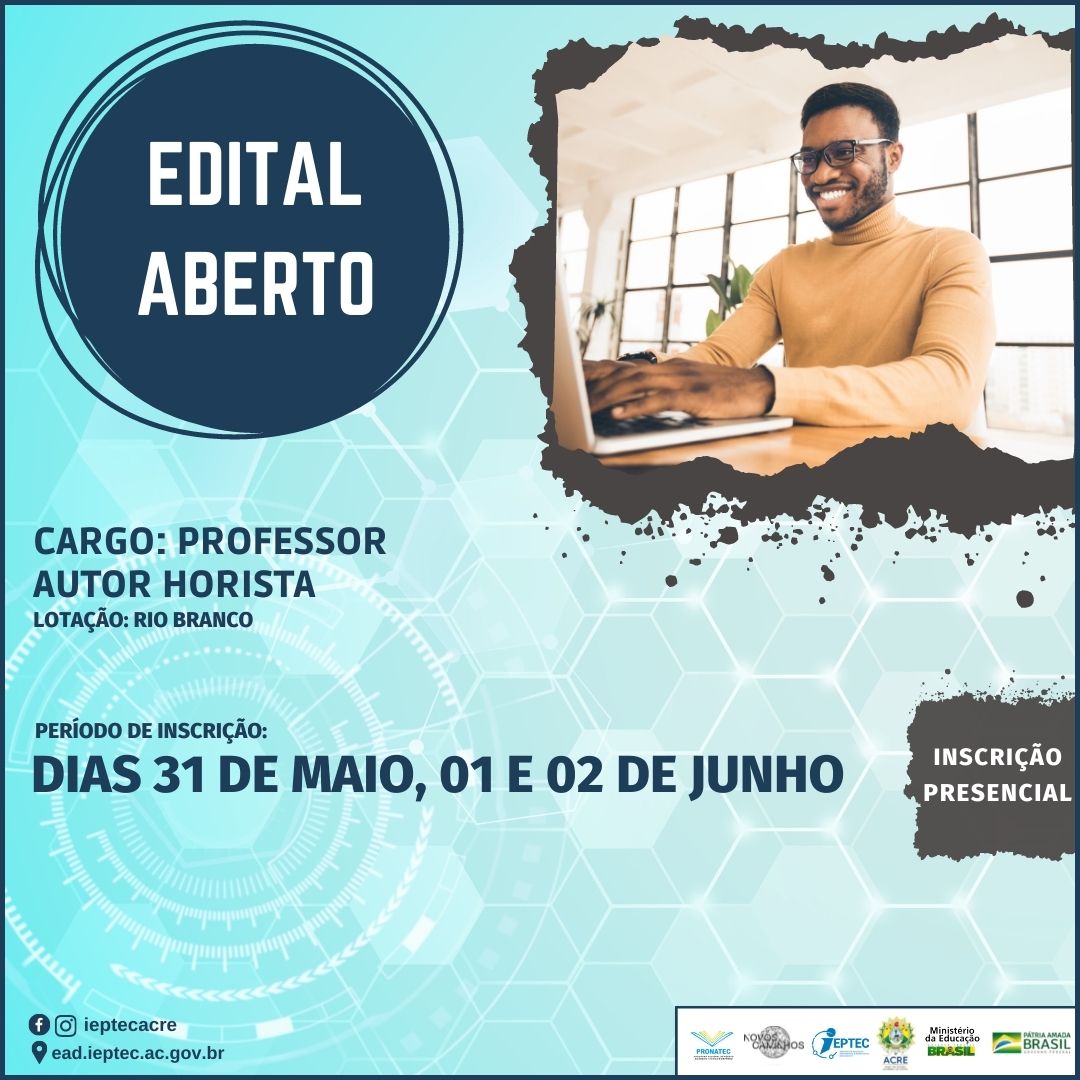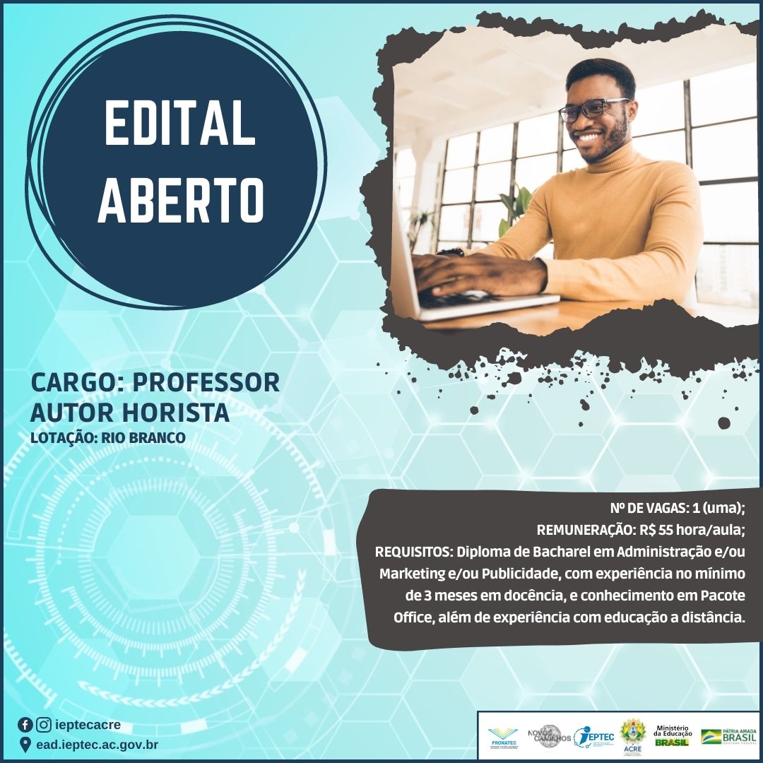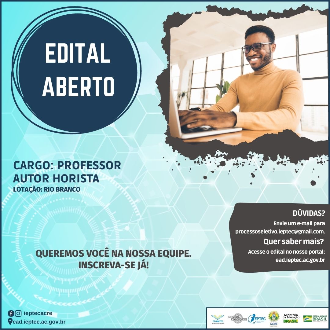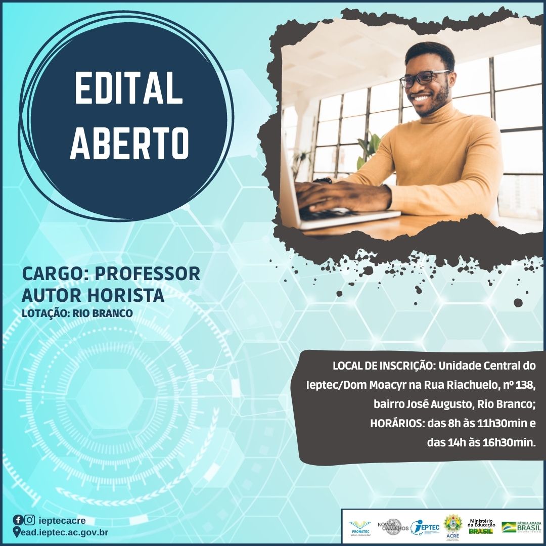 Faça parte você também da equipe de profissionais do Ieptec Dom Moacyr em Rio Branco, e INSCREVA-SE JÁ no nosso processo seletivo simplificado para SELEÇÃO DE BOLSISTAS, NA MODALIDADE DE PROFESSOR AUTOR HORISTA, PARA ATUAÇÃO NOS CURSOS TÉCNICOS DO PROGRAMA PRONATEC/NOVOS CAMINHOS NA MODALIDADE A DISTÂNCIA.