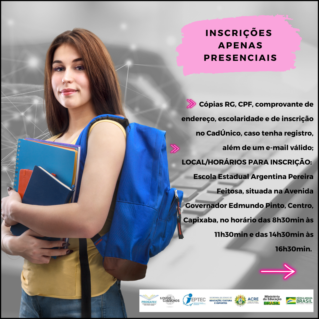 São 25 vagas para estudantes do ensino médio, como resultado de repactuação do Governo do Estado do Acre, por meio da Secretaria de Estado de Educação (SEE), junto ao Programa de Acesso ao Ensino Técnico e Emprego (Pronatec), em sua nova ação denominada Novos Caminhos do Governo Federal.