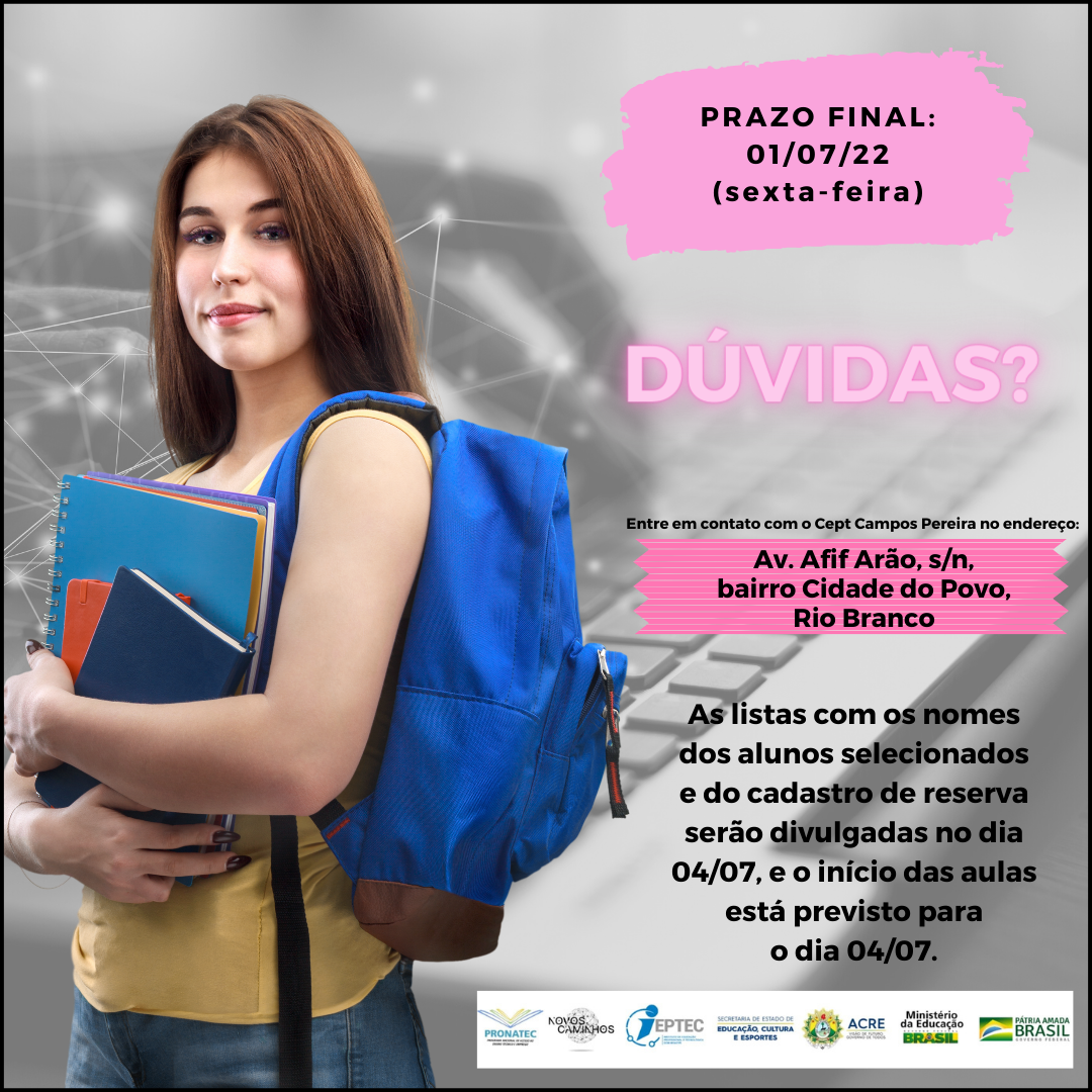 As aulas serão conduzidas pelo Centro de Educação Profissional e Tecnológica (CEPT) – Campos Pereira unidade descentralizada da rede Ieptec no Acre, estão previstas para iniciar no dia 04/07/22, estando a data condicionada ao preenchimento de 100% das vagas ofertadas em cada turma.