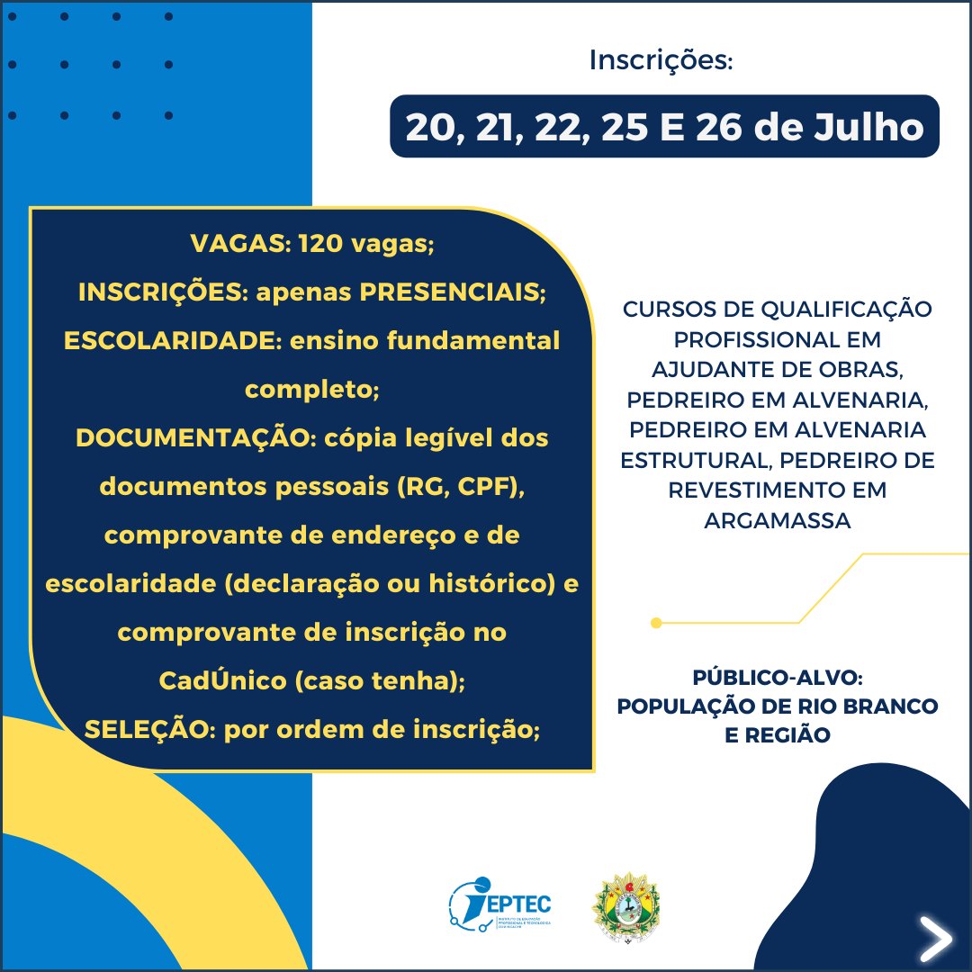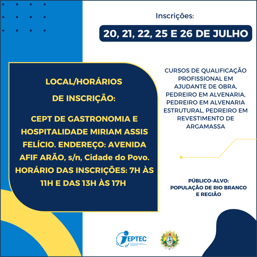 As inscrições já estão abertas e vão acontecer até o dia 26 de julho, e estão sendo realizadas apenas de forma PRESENCIAL, no Cept Gastronomia e Hospitalidade, na Cidade do Povo.