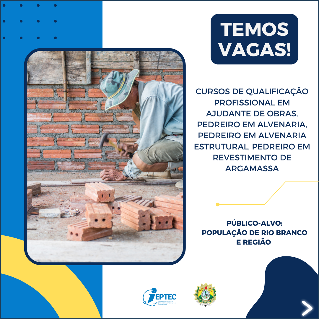 O Ieptec Dom Moacyr, junto ao Pronatec/Novos Caminhos, disponibiliza 120 vagas para educandos em cursos de qualificação profissional em AJUDANTE DE PEDREIRO, PEDREIRO EM ALVENARIA, PEDREIRO EM ALVENARIA ESTRUTURAL, PEDREIRO DE REVESTIMENTO DE ARGAMASSA, junto ao Pronatec/Novos Caminhos.