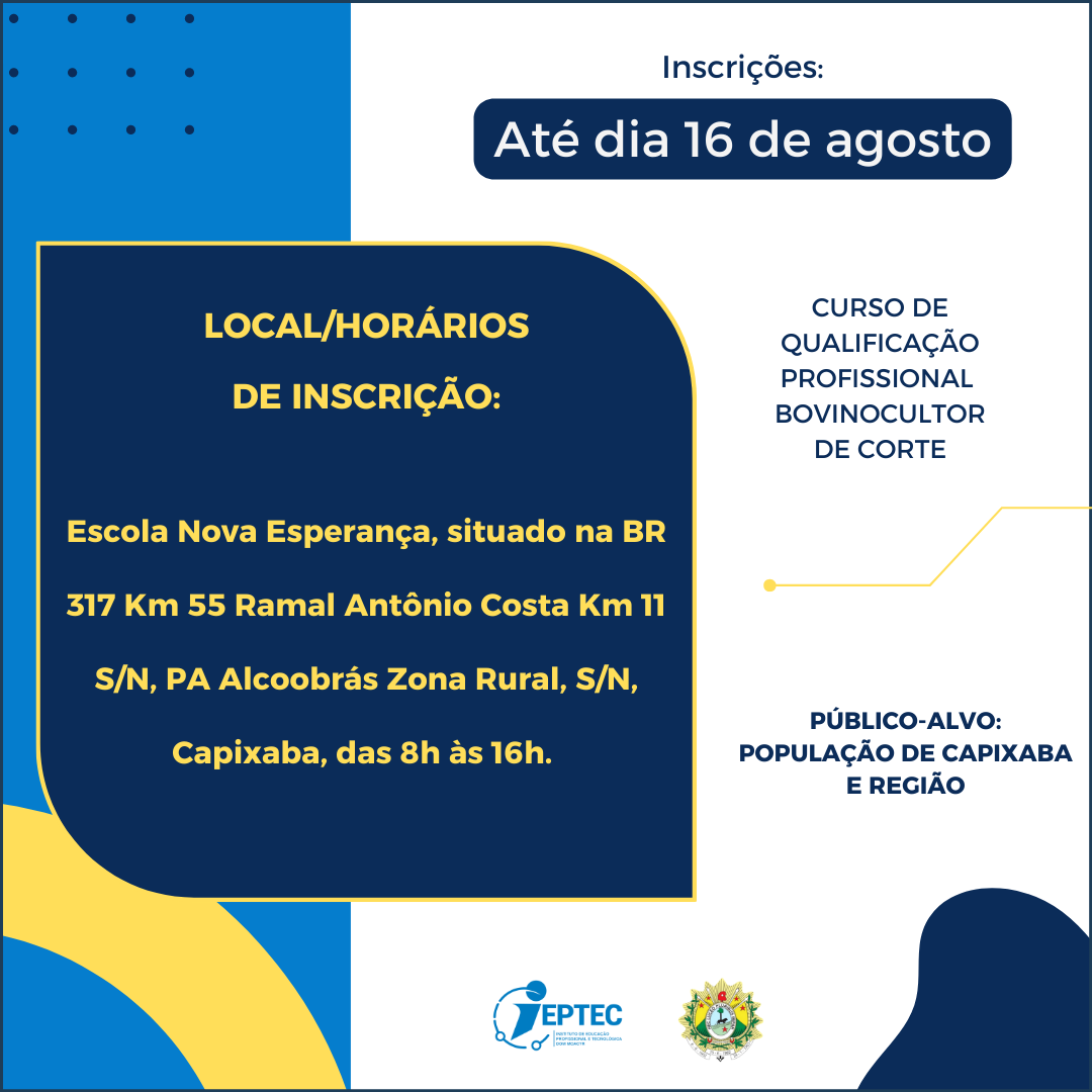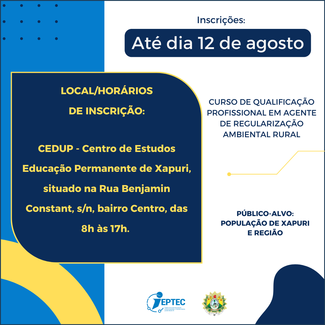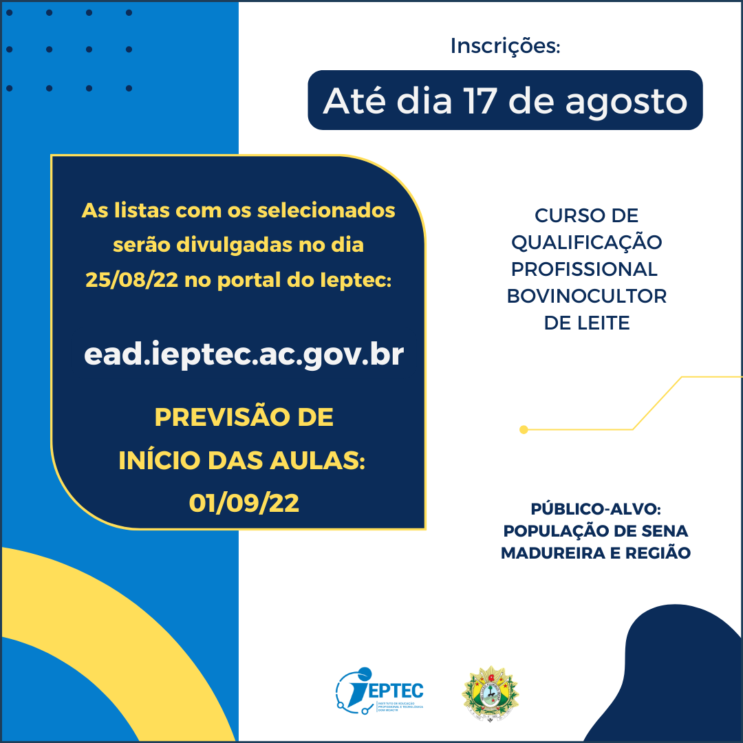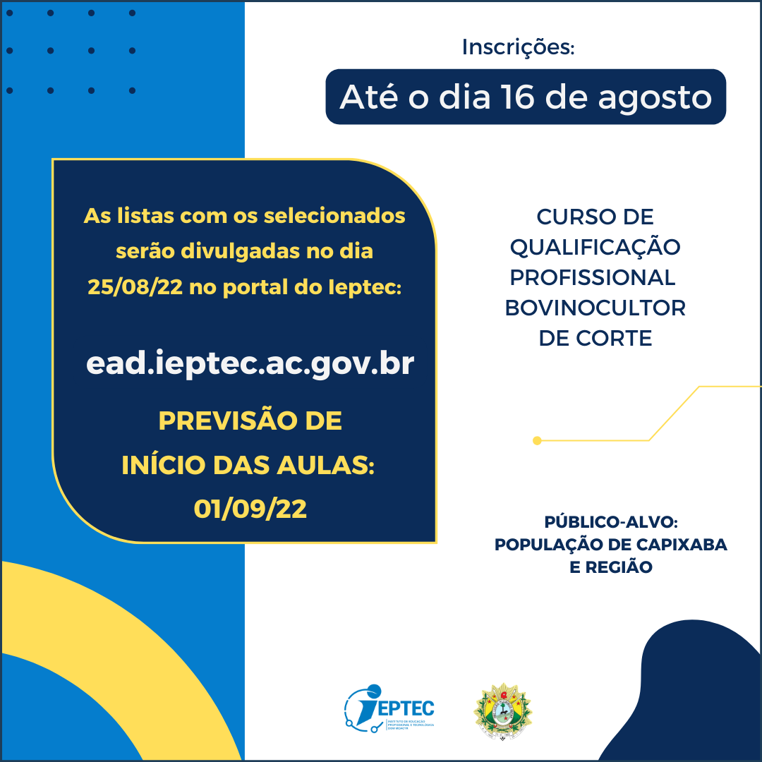 As aulas que serão conduzidas pelo Centro de Educação Profissional e Tecnológica (Cept) Roberval Cardoso, unidade descentralizada da rede Ieptec no Acre, estão previstas para iniciar no dia 01/09/22, estando a data condicionada ao preenchimento de 100% das vagas ofertadas em cada turma.