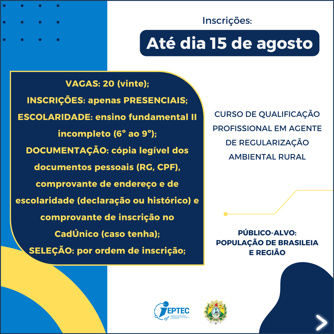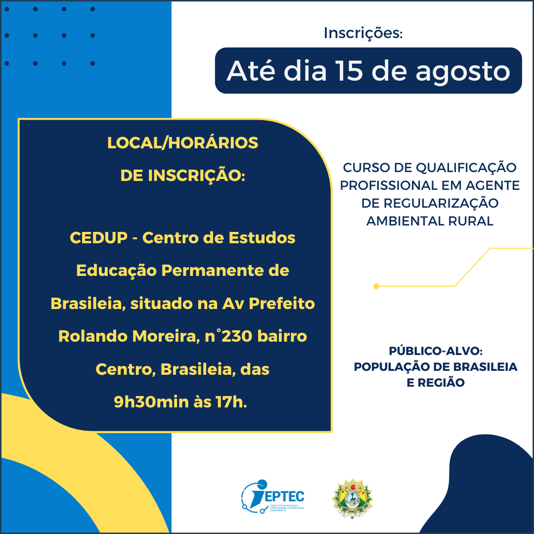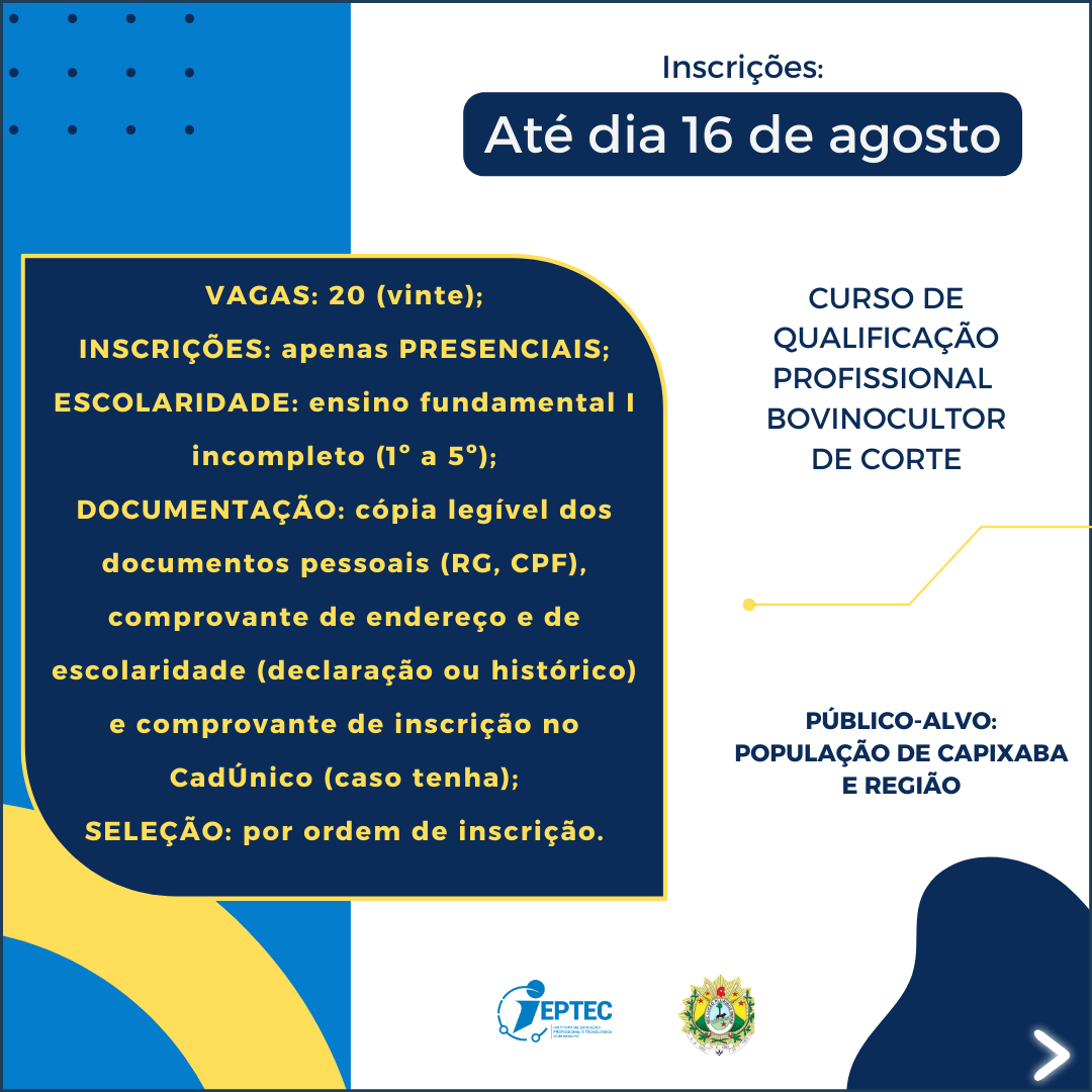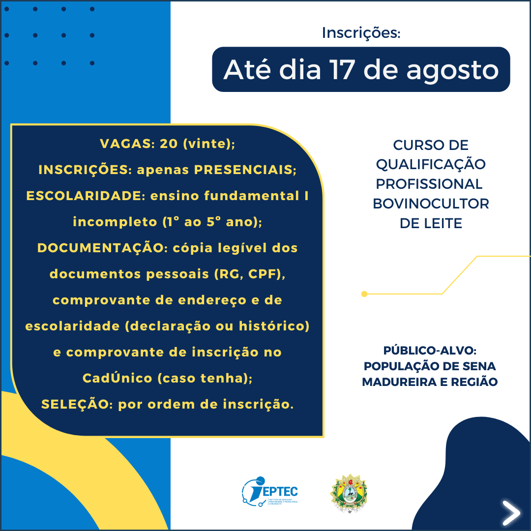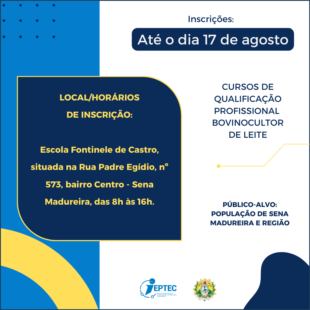 As aulas que serão conduzidas pelo Centro de Educação Profissional e Tecnológica (Cept) Roberval Cardoso, unidade descentralizada da rede Ieptec no Acre, estão previstas para iniciar no dia 01/09/22, estando a data condicionada ao preenchimento de 100% das vagas ofertadas em cada turma.