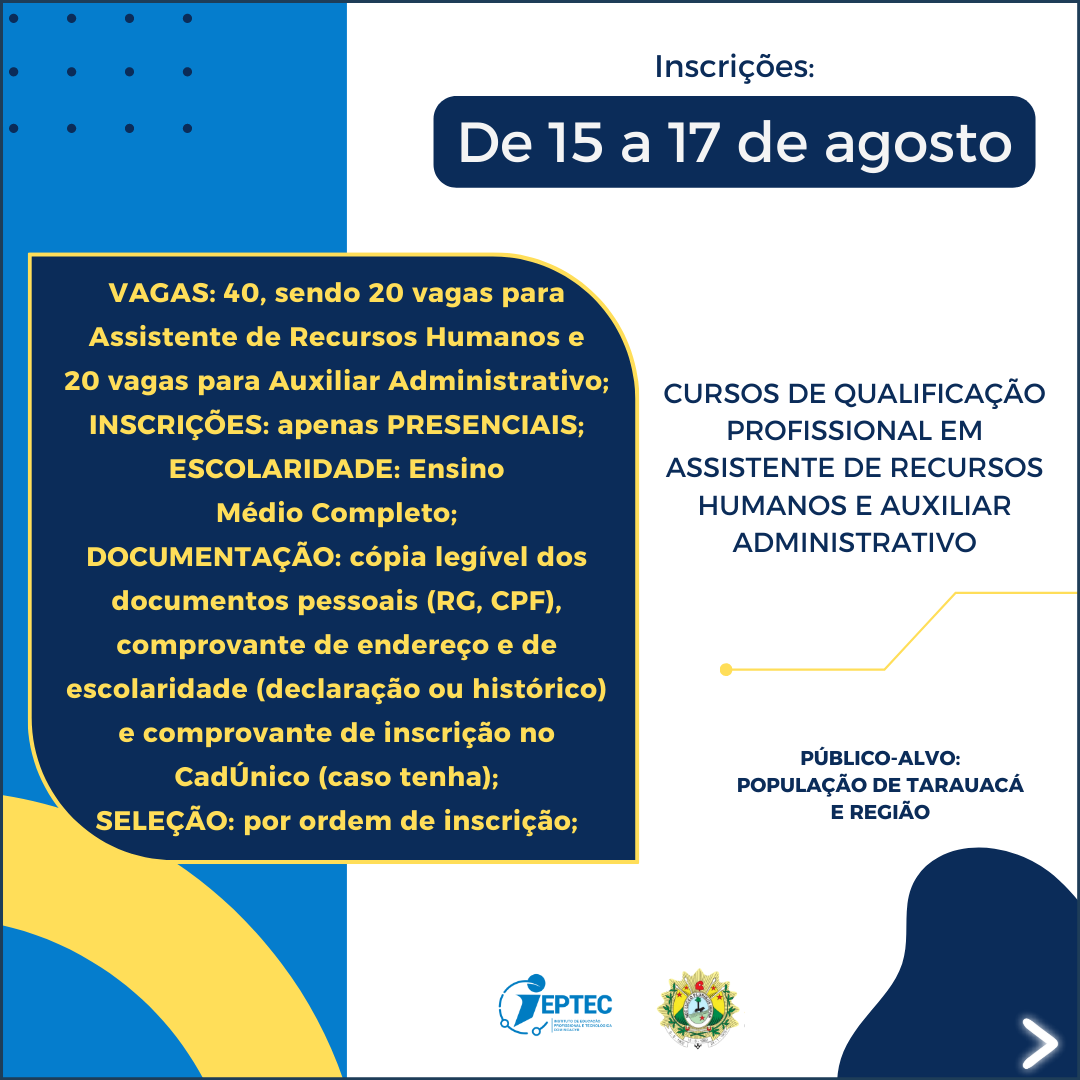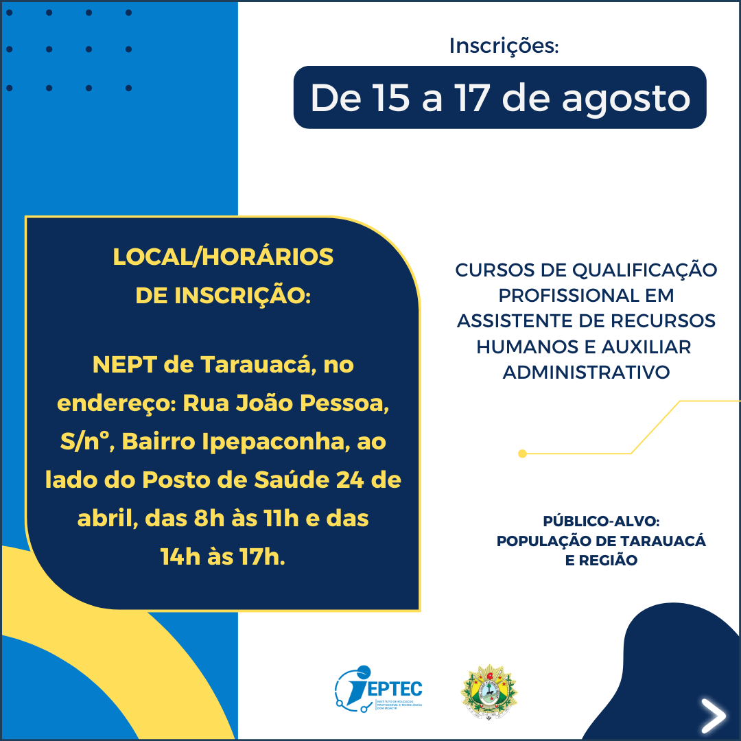 As aulas que serão conduzidas pelo Núcleo de Educação Profissional e Tecnológica (NEPT) Tarauacá, unidade descentralizada da rede Ieptec em Tarauacá, e estão previstas para iniciar no dia 01 de setembro de 2022 estando a data condicionada ao preenchimento de 100% das vagas ofertadas em cada turma.