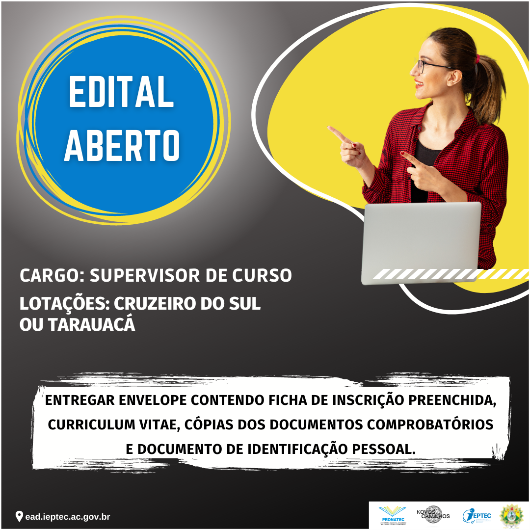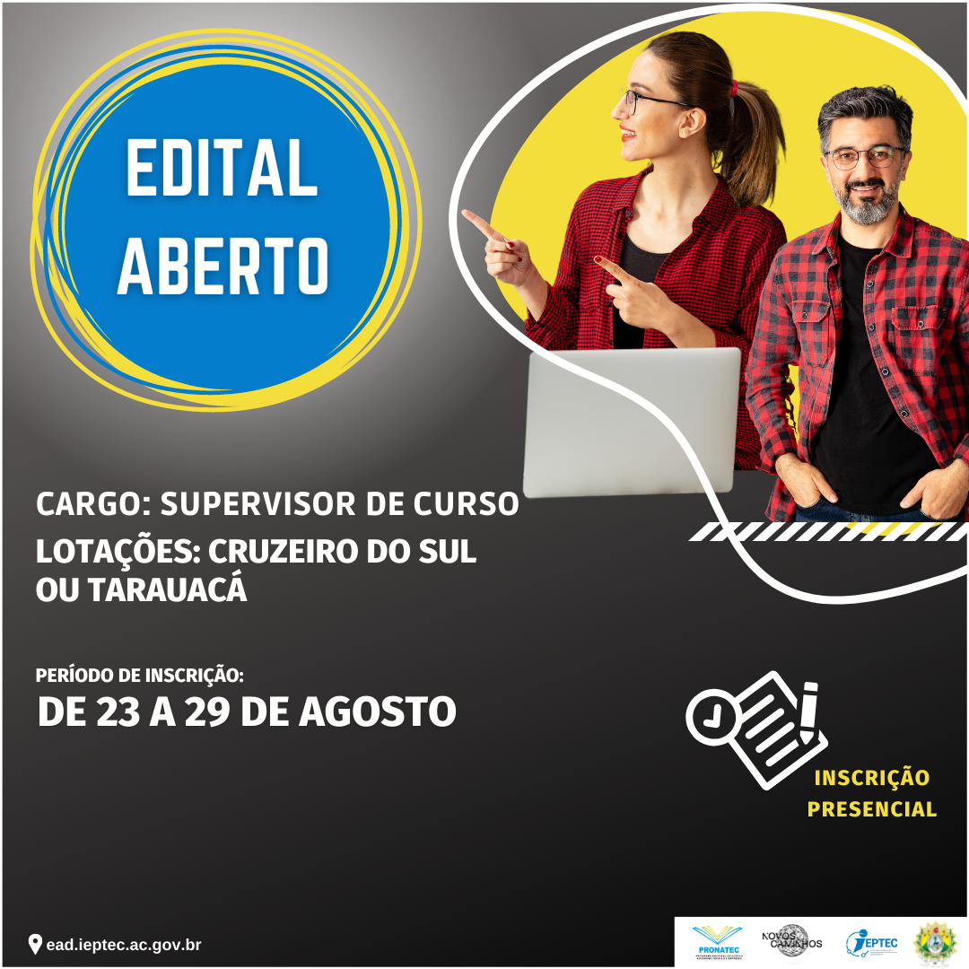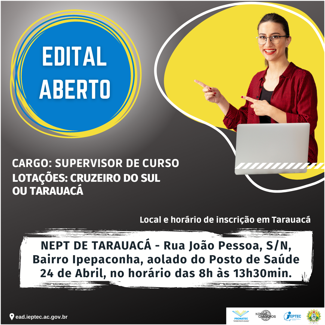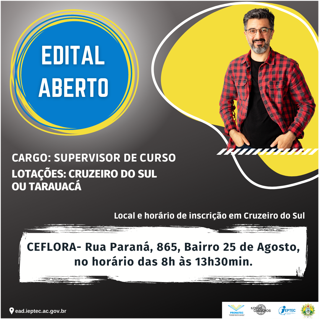* INSCRIÇÕES: As inscrições ocorrem de forma presencial, de 23 a 29 de agosto. Locais: em CRUZEIRO DO SUL: no CEFLORA, Rua Paraná, 865, Bairro 25 de Agosto, no horário das 8h às 13h30min; em TARAUACÁ: no NEPT TARAUACÁ, Rua João Pessoa, S/N, bairro Ipepaconha, ao lado do Posto de Saúde 24 de Abril, no horário das 8h às 13h30min.