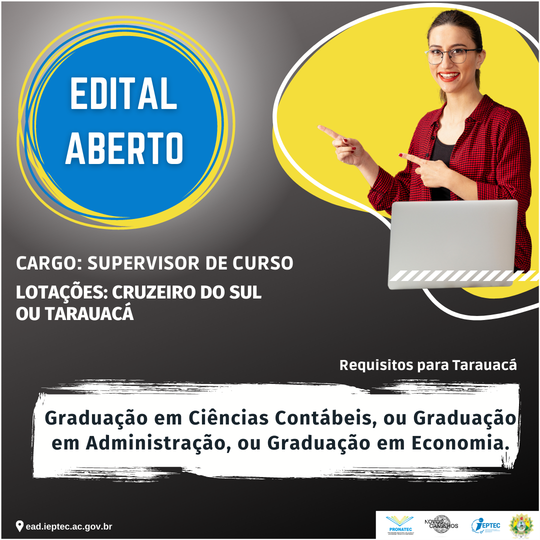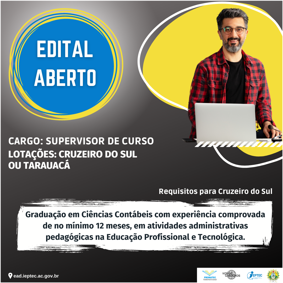 Os candidatos deverão atender aos seguintes requisitos: Graduação em Ciências Contábeis com experiência comprovada de no mínimo 12 meses, em atividades administrativas pedagógicas na Educação profissional e Tecnológica, para vaga de Cruzeiro do Sul; Graduação em Ciências Contábeis, ou Graduação em Administração, ou Graduação em Economia, para vaga de Tarauacá.