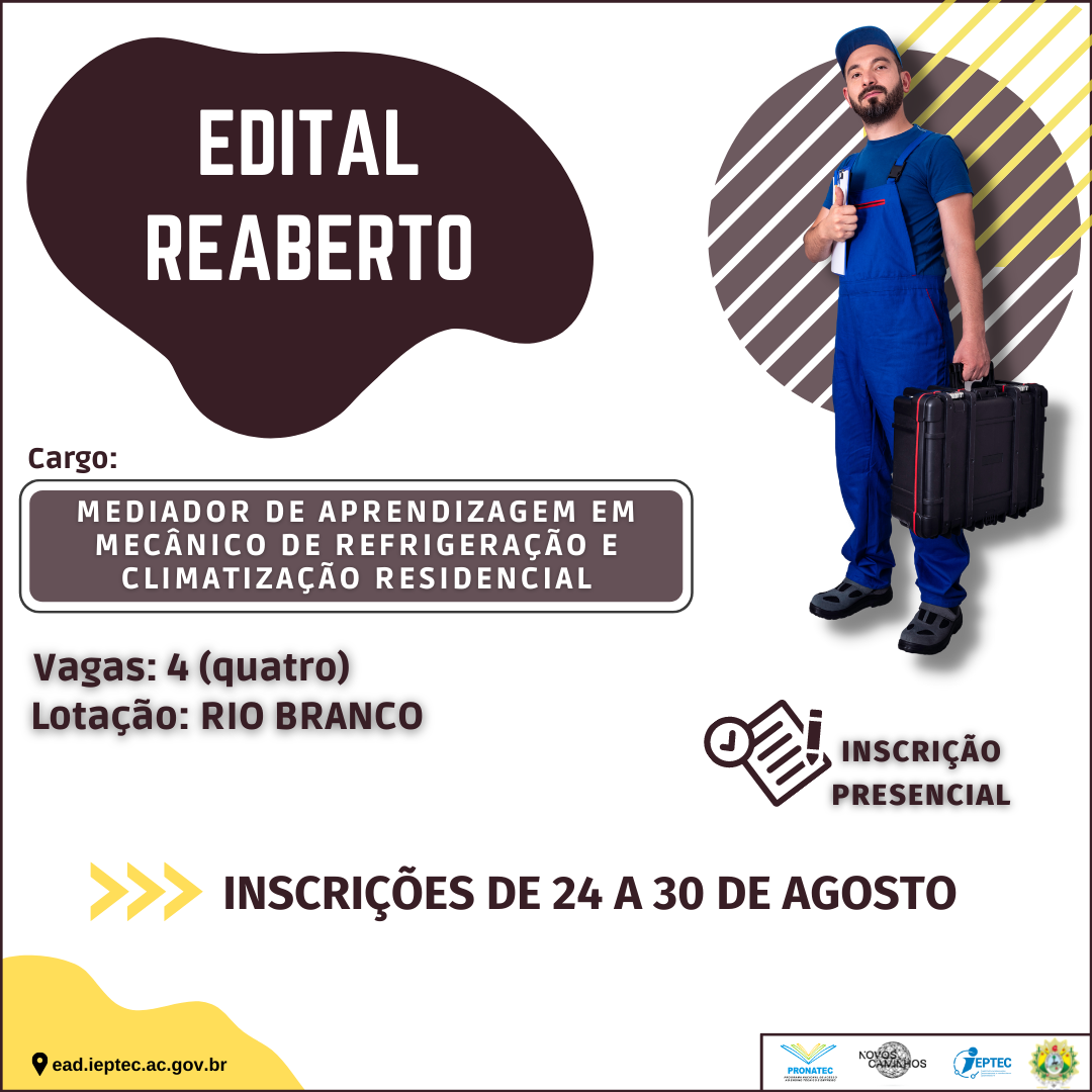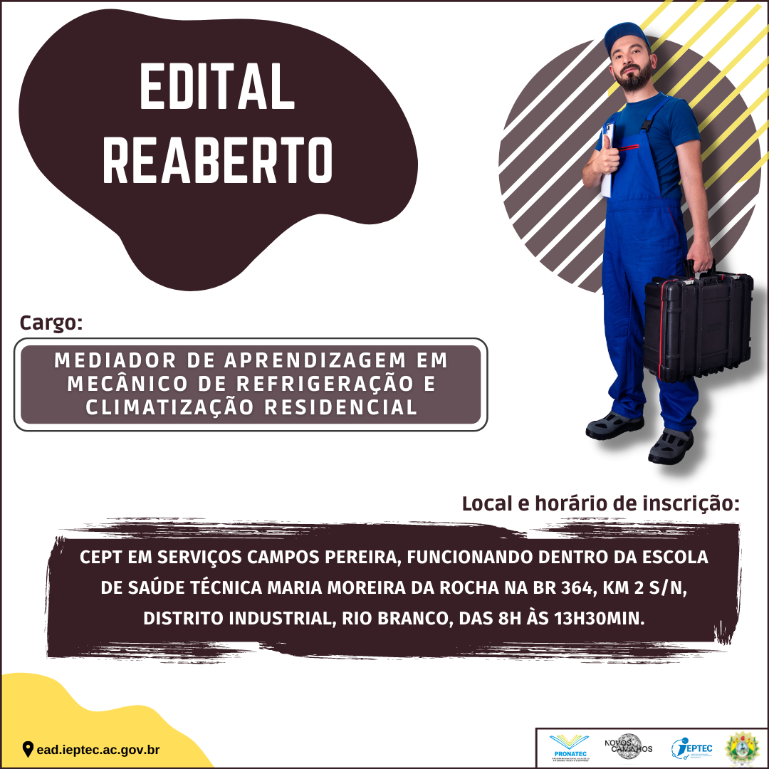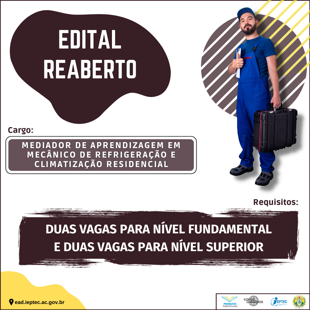 São 4 vagas para MEDIADOR DE APRENDIZAGEM HORISTA para o curso de MECÂNICO DE REFRIGERAÇÃO E CLIMATIZAÇÃO RESIDENCIAL, sendo duas vagas para nível Fundamental e duas vagas para nível superior.