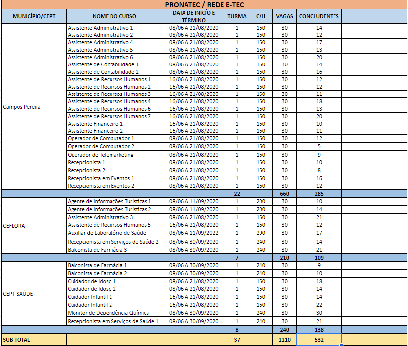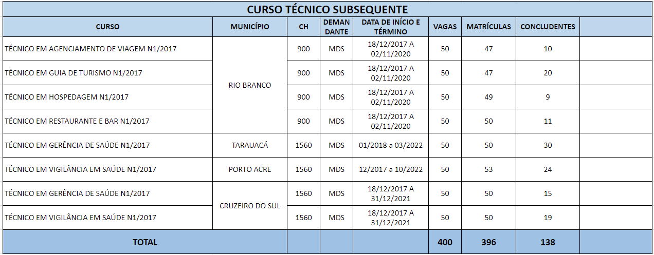No que se refere aos cursos subsequentes eles foram executados no período de fevereiro de 2022 a dezembro de 2023, conforme dados do quadro abaixo.