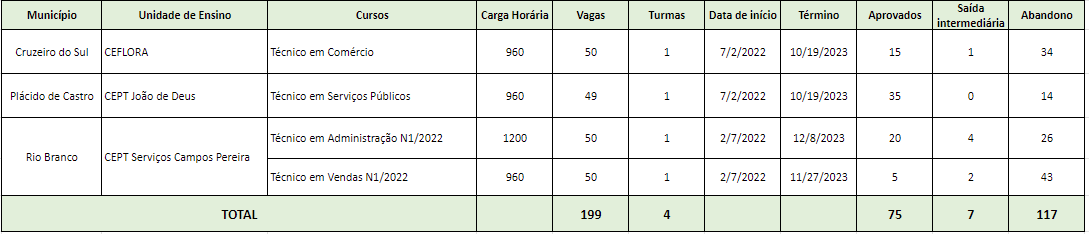 Este programa também tinha o propósito de ampliar e democratizar o acesso de jovens e adultos trabalhadores residentes em regiões de difícil acesso nos Cursos Técnicos de Nível Médio, públicos e gratuitos, em regime de colaboração entre União, Estados, Distrito Federal e Municípios, de forma a incentivar a inserção no mundo do trabalho e contribuir para o desenvolvimento do Estado do Acre.