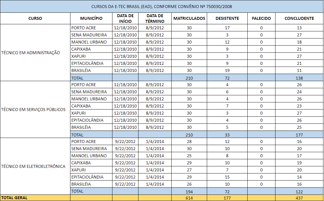 Haja vista, que o Estado do Acre, através do IEPTEC, foi um dos primeiros Estados da Federação a aderir ao Programa, firmado pelo Convênio nº 750030/2008 para execução da primeira fase do e-Tec, no qual foi atingido o marco de mais de 80% de suas metas. Com o objetivo de possibilitar o acesso dos cursos técnicos de nível médio na modalidade EaD (Educação à Distância/semi-presencial, sendo 80% à distância e 20% presencial) para as regiões distantes das instituições de Educação Profissional e Técnica, o Programa atendeu jovens, adultos e trabalhadores residentes em municípios não assistidos por Escolas Técnicas que tinham concluído o ensino médio, ou estavam em vias de concluir, incentivando-os à capacitação técnica e ao ingresso no mundo do trabalho, por meio da habilitação de técnicos de nível médio.